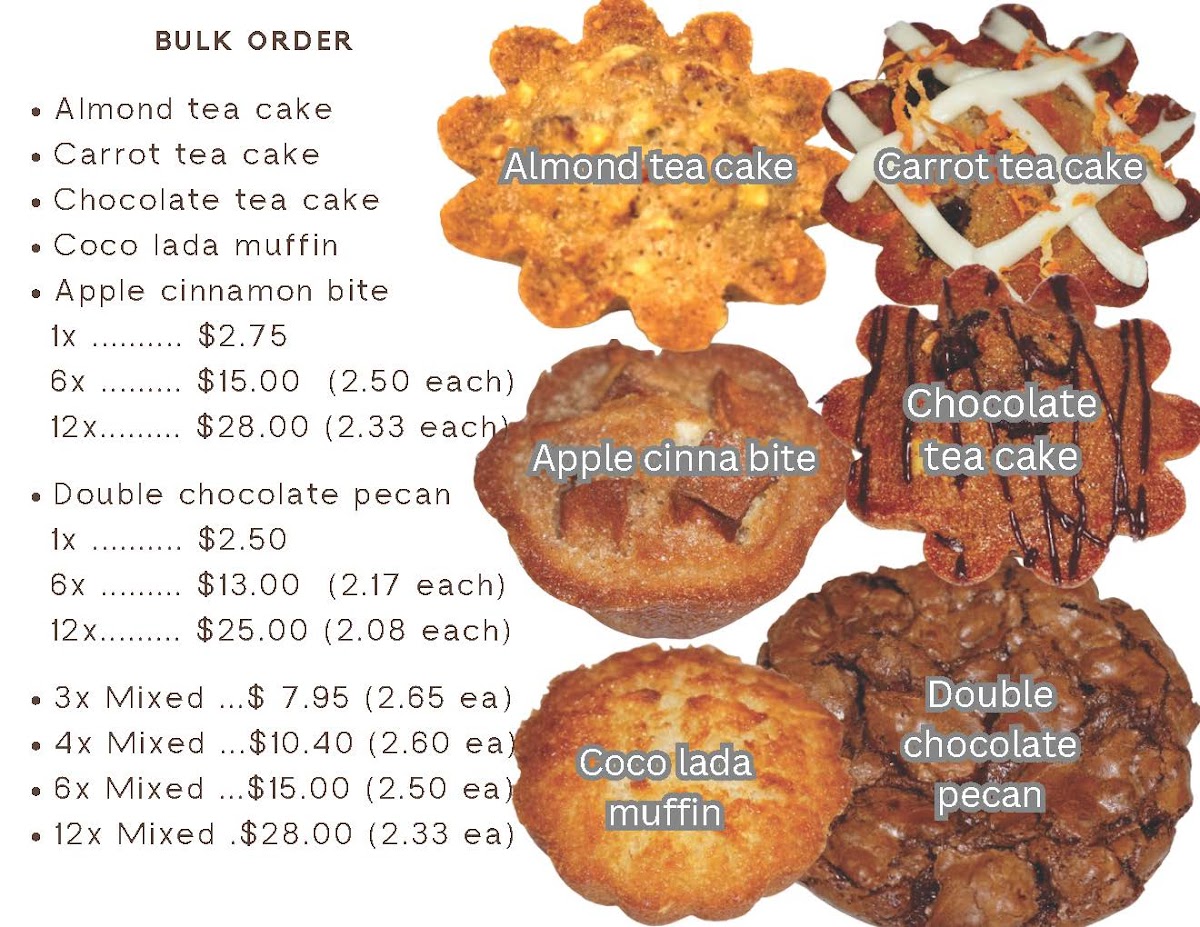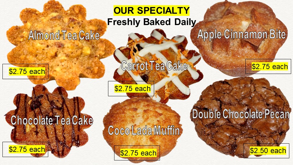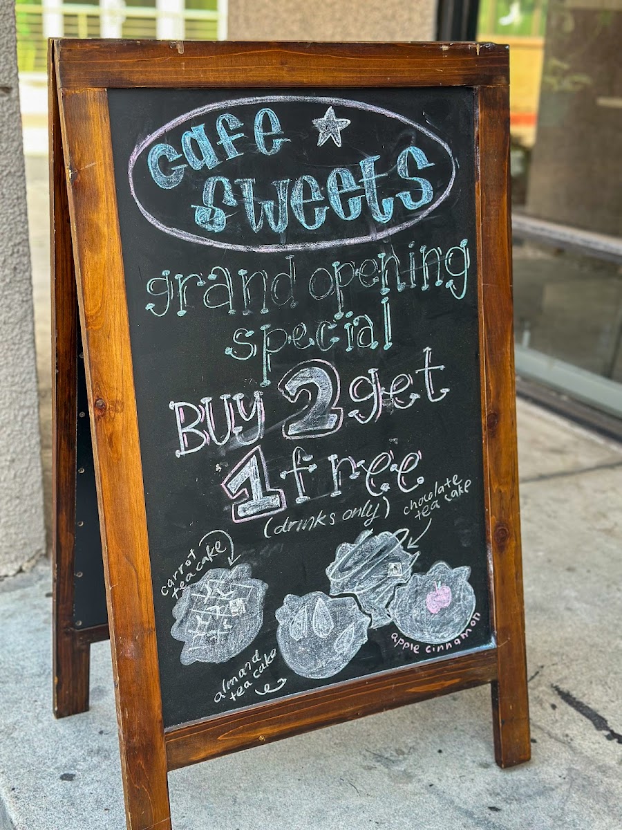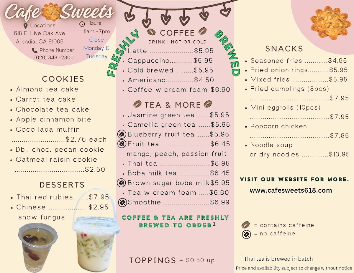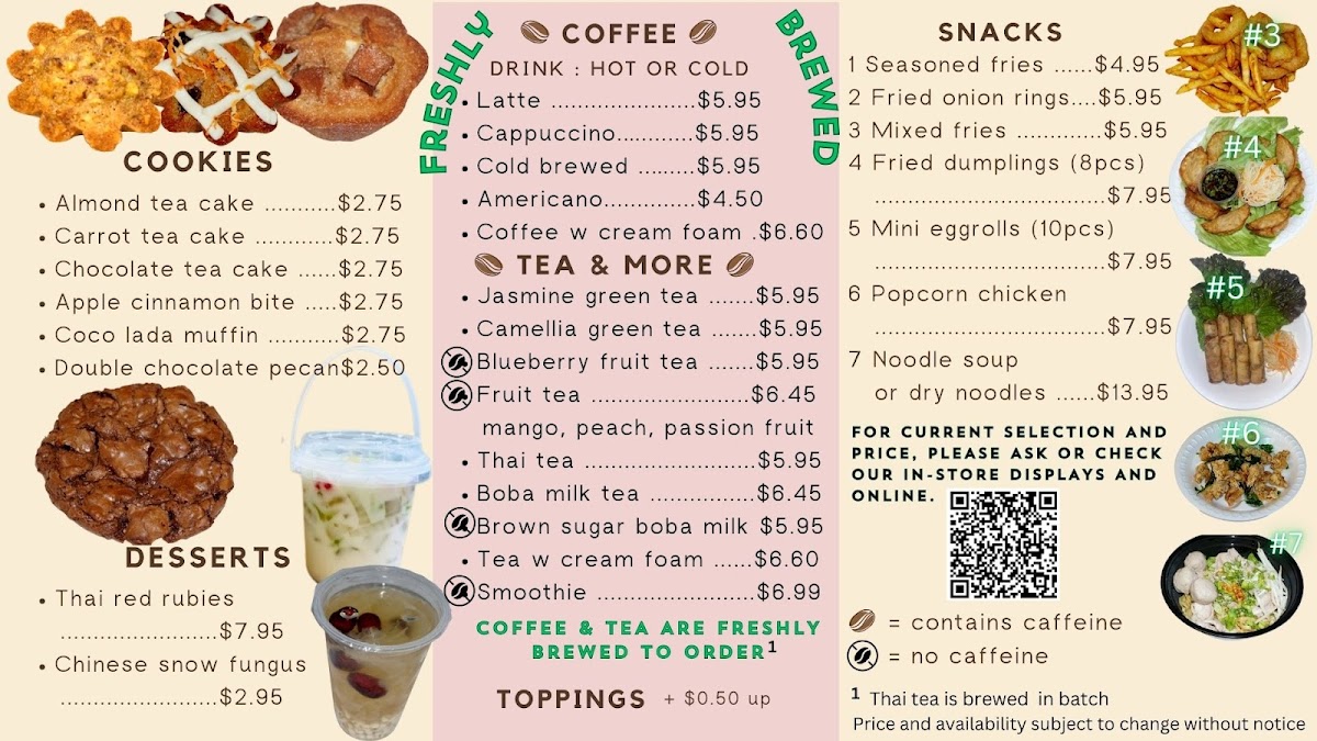 The menu at Café Sweets offers a delightful array of beverages, snacks, and desserts that cater to various tastes. For coffee lovers, there's the Matcha Top Latte, Caramel Macchiato, MochaTiramisu Latte, and classic Espresso. If you're in the mood for a savory snack, try the Onion Rings, Seasoned Fries, Mixed Fries, or the popular Popcorn Chicken and Mini Eggrolls (12 pieces). For dessert, the Thai Red Ruby is a must-try. The bakery section features fresh Banana Muffins, Blueberry Muffins, and Chocolate Muffins, perfect for a light treat. The fruit tea selection is vibrant, offering Passion Fruit Jasmine GT, Blueberry Fruit Tea, Passion Fruit Oolong GT, Strawberry Jasmine GT, and Peach Oolong GT. Matcha enthusiasts will enjoy the variety of options, including Dirty Matcha, Matcha Thai Tea, Strawberry Matcha, Hojicha Latte, and Matcha Latte. If you prefer something sweeter, indulge in the selection of Mini Carrot Tea Cakes, Apple Cinnamon Tea Cake, Almond Tea Cakes, and Carrot Tea Cake. For a refreshing smoothie, go for a Strawberry Mango Smoothie, Taro Smoothie, Mango Smoothie, Strawberry Smoothie, or Coconut Smoothie. In the fridge section, you’ll find Snow Fungus and Grass Jelly. The milk tea offerings include the tropical Hawaiian Green Tea, Hibiscus Hawaiian Tea, Hibiscus Golden Tea, Oolong Milk Tea, and the popular Thai Milk Tea, providing a variety of flavors for every preference. This menu blends comfort, creativity, and indulgence in every dish, ensuring there's something for everyone.
